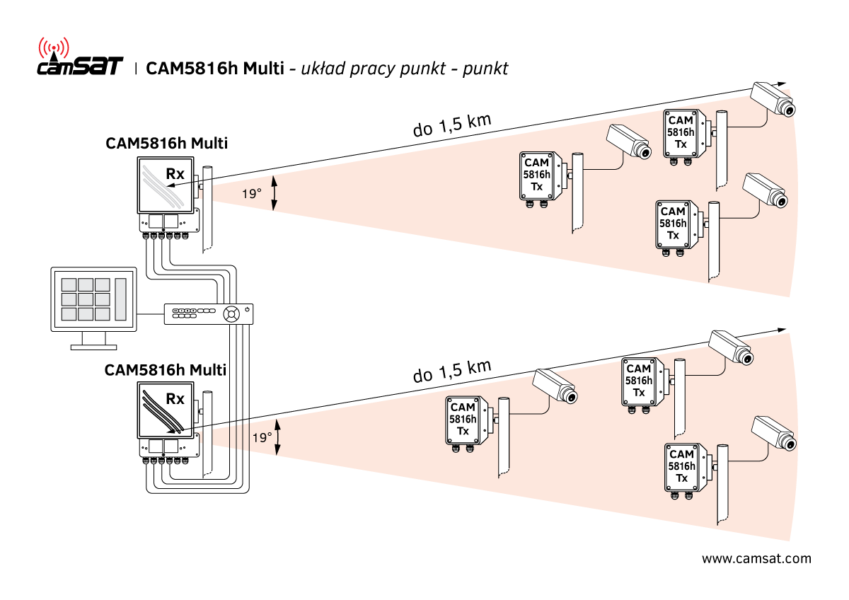 CAM-5816h Multi to bezprzewodowy zestaw do jednoczesnej transmisji czterech sygnałów wideo oraz ośmiu sygnałów audio. Zestaw pozwala na redukcję ilości wymaganych zestawów urządzeń w systemie bezprzewodowym aż czterokrotnie. Jest to szczególnie istotne przy zmniejszaniu kosztów monitoringu, ale także przy montażu takich systemów. Do tej pory system monitoringu obsługujący osiem kamer bezprzewodowych wymagał zastosowania ośmiu zestawów. Dzięki zastosowaniu zestawu CAM-5816 Multi możliwe jest zmniejszenie ich ilości do dwóch zestawów. Należy szczególnie podkreślić iż jest to rozwiązanie innowacyjne na skalę kraju, a działania prowadzone w tym kierunku były zainicjowane wieloma zapytaniami ze strony klientów.